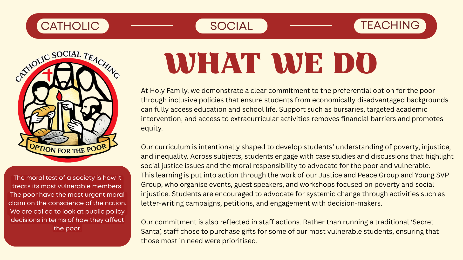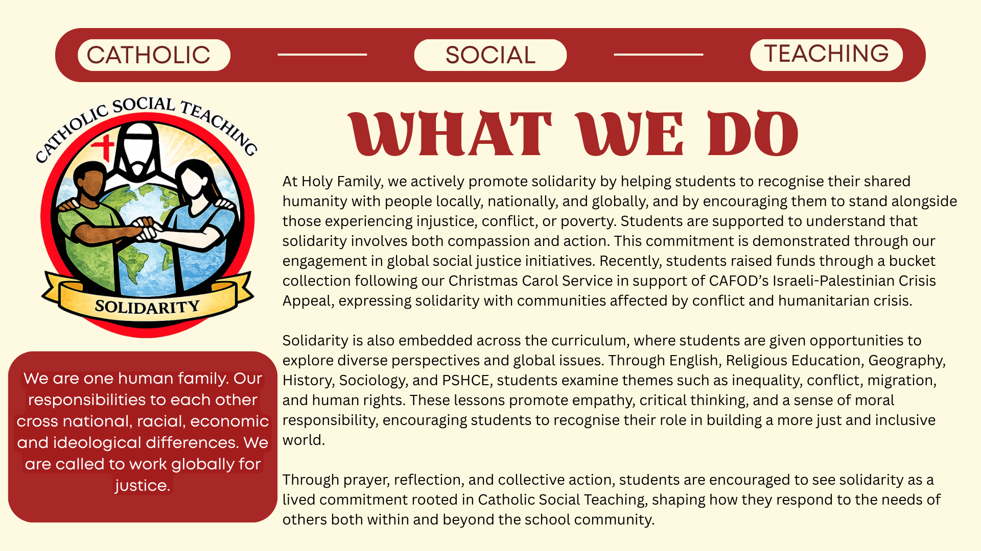 Catholic Social Teaching (CST) is explicit, coherent, and integral to the curriculum at Holy Family Catholic School & Sixth Form. This document demonstrates how CST shapes curriculum intent, implementation, and impact across subjects and key stages, ensuring that the school’s Catholic mission is lived consistently through teaching, learning, and assessment.