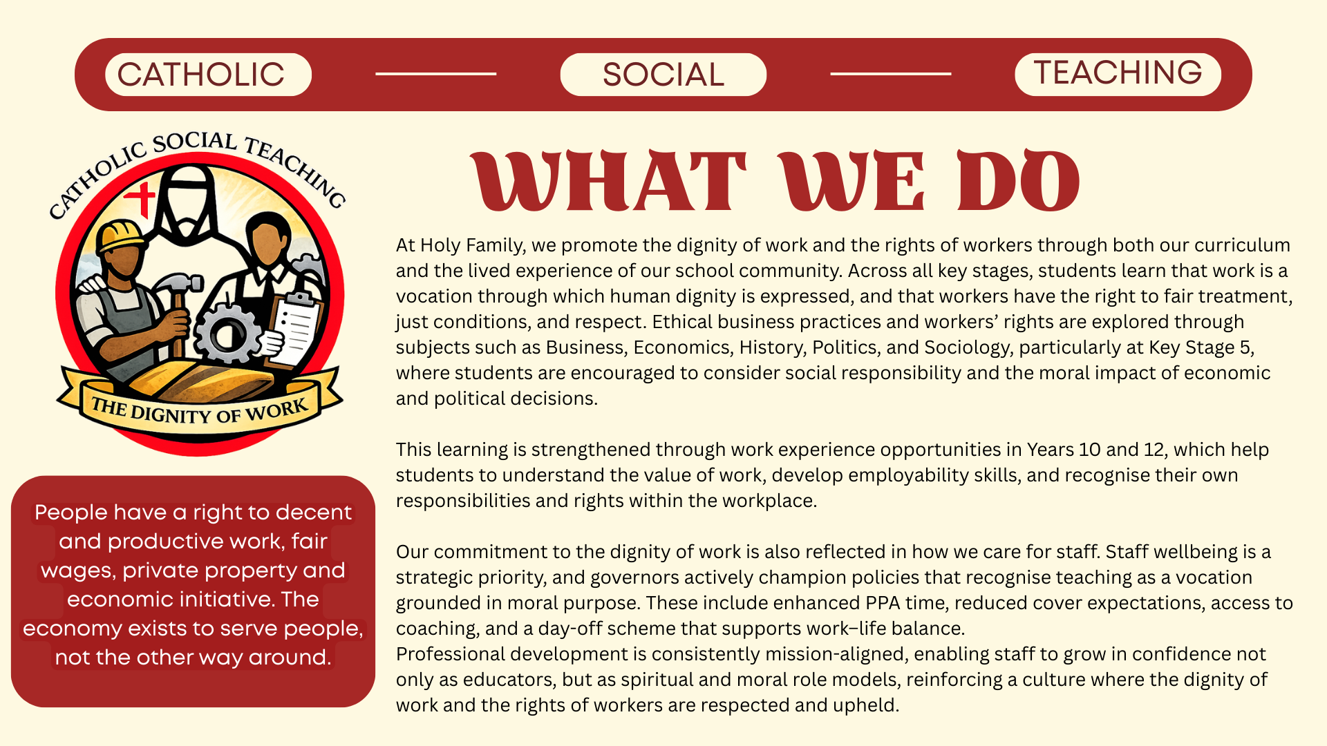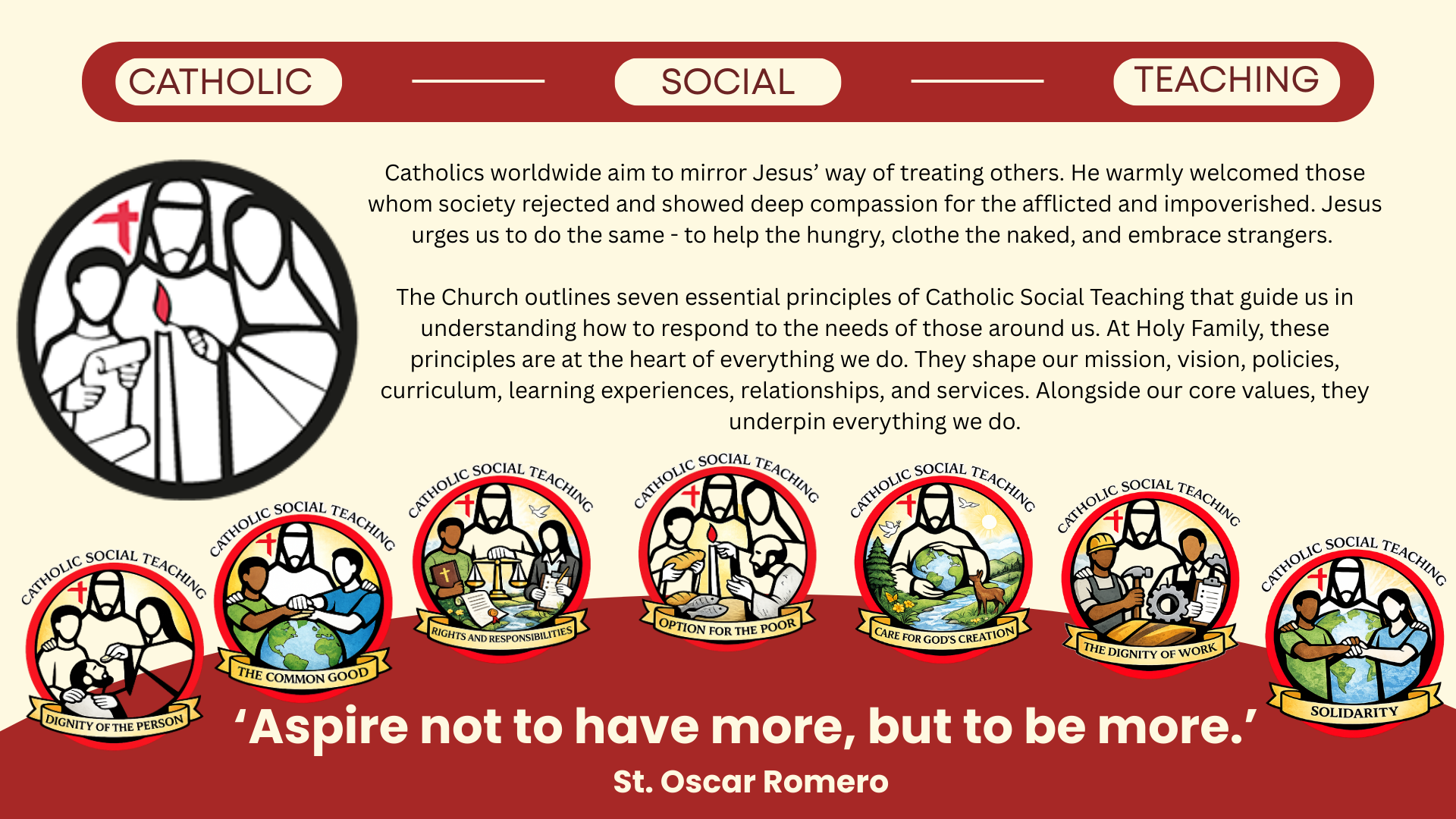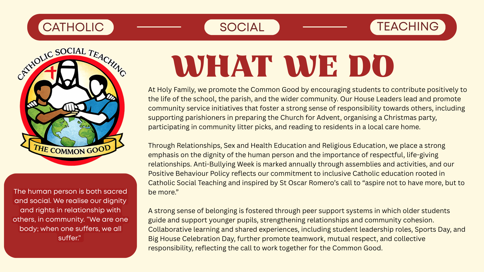Catholic Social Teaching (CST) is explicit, coherent, and integral to the curriculum at Holy Family Catholic School & Sixth Form. This document demonstrates how CST shapes curriculum intent, implementation, and impact across subjects and key stages, ensuring that the school’s Catholic mission is lived consistently through teaching, learning, and assessment.