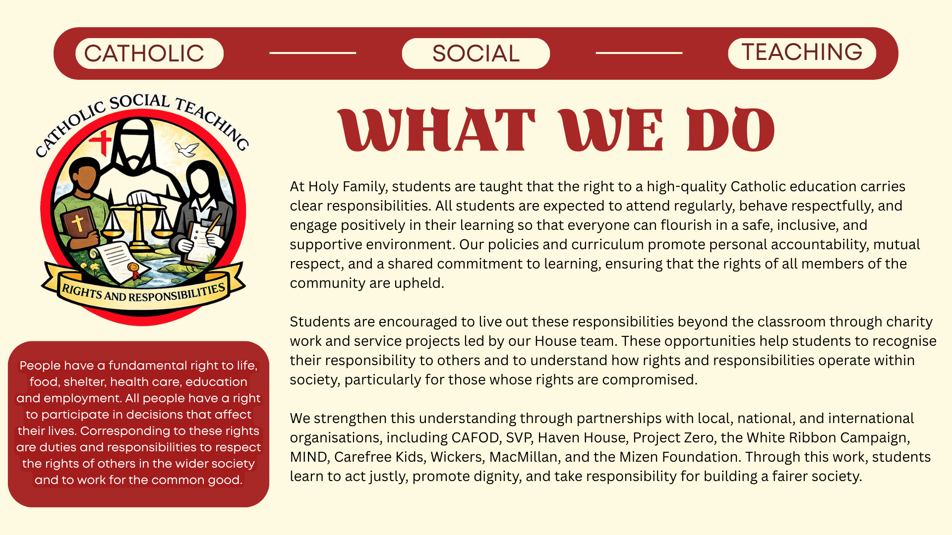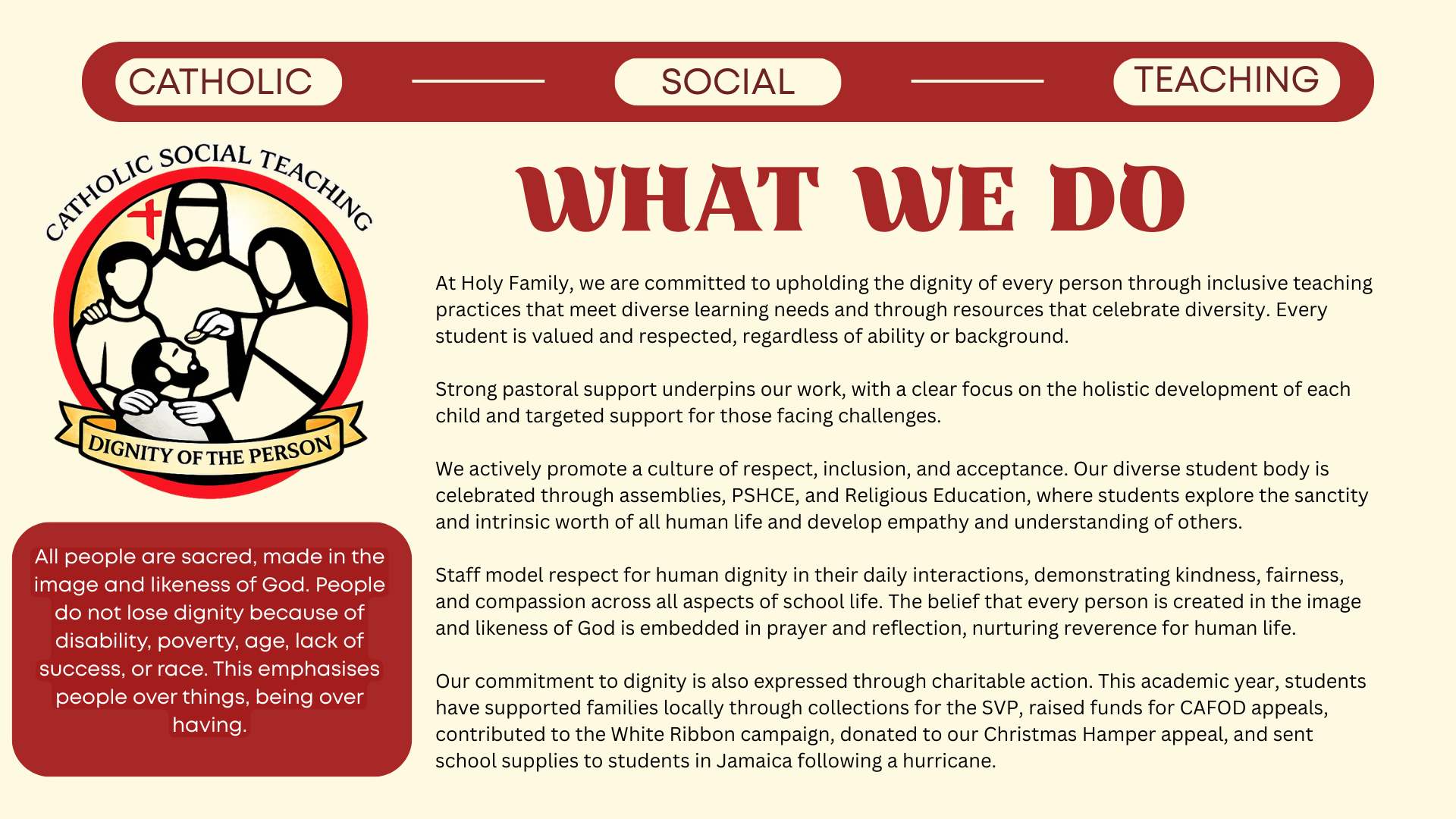 Catholic Social Teaching (CST) is explicit, coherent, and integral to the curriculum at Holy Family Catholic School & Sixth Form. This document demonstrates how CST shapes curriculum intent, implementation, and impact across subjects and key stages, ensuring that the school’s Catholic mission is lived consistently through teaching, learning, and assessment.