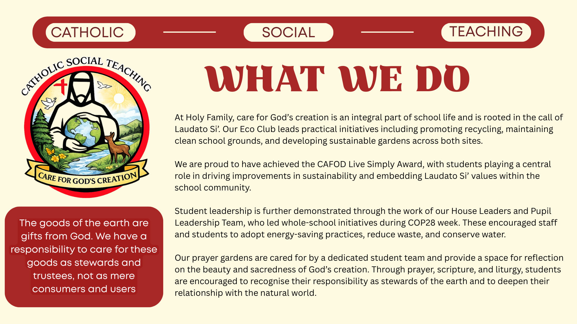Catholic Social Teaching (CST) is the lens through which we view the world - and act upon it. It is taught across the curriculum, shaping how subjects explore issues of justice, dignity, and the common good.